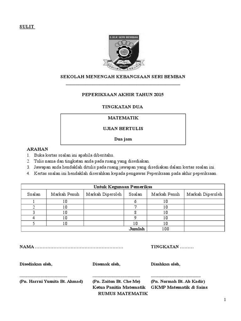 Soalan Matematik Tingkatan 2 Pdf