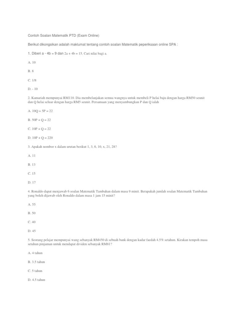 Contoh Soalan Matematik Ptd Pdf